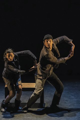 Au moment où nous observons cet étrange binôme, rien ne nous indique son histoire. Accrochés l’un à l’autre, bouée ou boulet, ils se maintiennent au bord du gouffre, pour le meilleur et pour le pire .Ces deux rien, clandestins du réel s’occupent ,s’écrivent, s’inventent un ailleurs, un entre-deux et choisissent de passer à l’abordage du monde réel par le biais du jeu. Entre danse et clowneries, le duo emporte les spectateurs du rire aux larmes sans prononcer le moindre son.