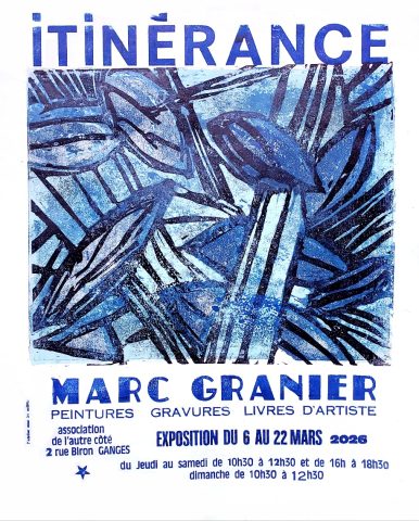 L’association de l’autre côté, espace culturel, citoyen et solidaire au cœur de Ganges (34), est heureuse de vous convier au vernissage de l’exposition Itinérance, de Marc Granier.