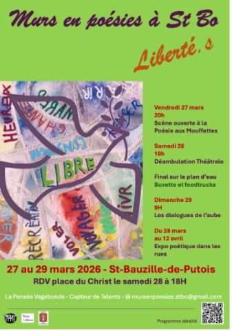 – Du 28 mars au 12 avril: Expo poétique en plein air. Les rues deviennent galerie. Poèmes d’habitants, textes d’auteurs — sur des supports qui vont du murmure minimaliste au grand format qui claque au vent.